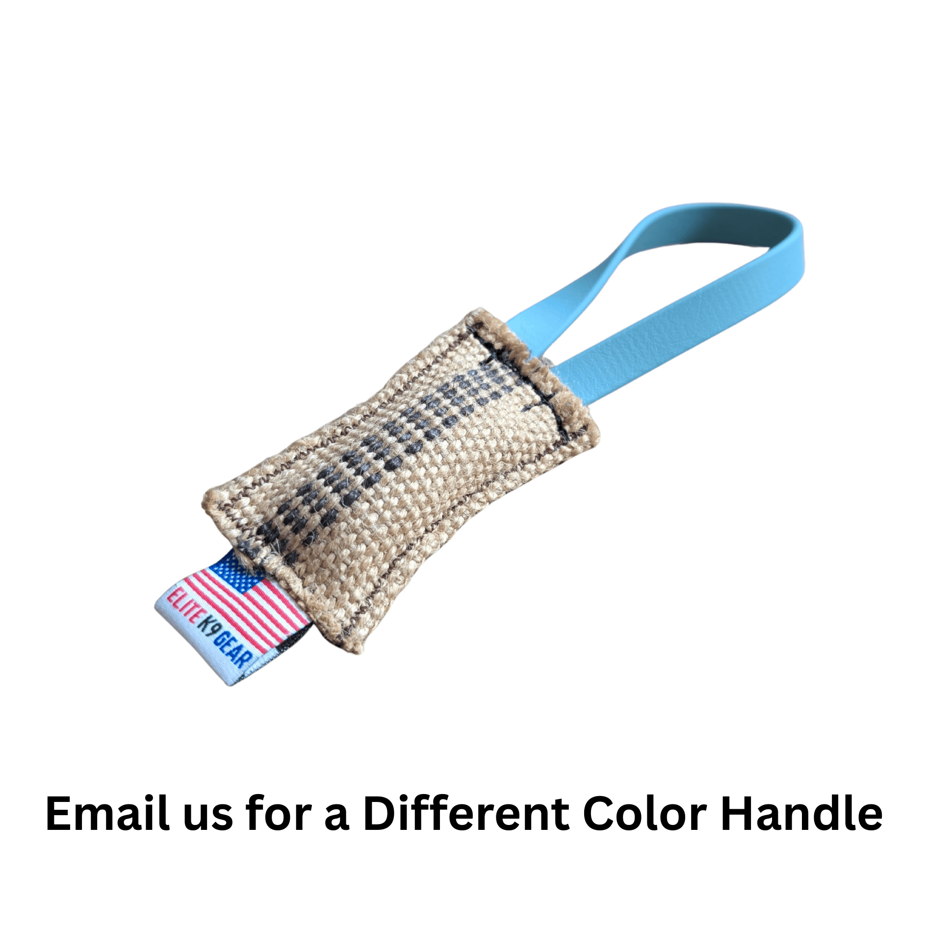 Our jute tug is made with a short durable BioThane handle so you can hold on to the end while playing with your furry friend. The Jute and BioThane combination is designed to durable, tough, and long lasting**. The Miniature Jute Tug has no squeaker inside.